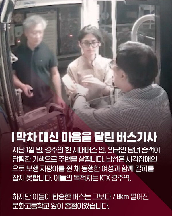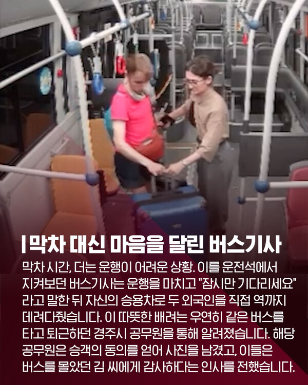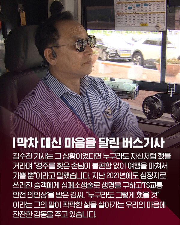 이전 기사보기 다음 기사보기 [카드뉴스]경주 버스기사 승객을 두번 태운 사연? 바로가기 복사하기 본문 글씨 줄이기 본문 글씨 키우기 스크롤 이동 상태바 카드뉴스 [카드뉴스]경주 버스기사 승객을 두번 태운 사연? 기자명 서석민 입력 2025.08.11 17:15 댓글 0 페이스북(으)로 기사보내기 트위터(으)로 기사보내기 URL복사(으)로 기사보내기 다른 공유 찾기 바로가기 본문 글씨 키우기 본문 글씨 줄이기 이 기사를 공유합니다 페이스북(으)로 기사보내기 트위터(으)로 기사보내기 URL복사(으)로 기사보내기 닫기 헬로tv뉴스 유튜브에서 헬로tv뉴스를 구독해주세요! [제보] 카카오톡 '헬로tv뉴스' 검색 후 채널 추가 서석민 ssm4125@lghv.net 키워드 #경주버스기사 #막차감동 #한밤의기적 #시각장애인배려 #따뜻한마음 #감동실화 #의인버스기사 #7_8km감동드라이브 #버스기사미담 #길위의천사 #누구라도했을일 #경주여행이야기 #작은배려큰감동 #종점에서시작된이야기 #버스에서승용차로 저작권자 © LG헬로비전 무단전재 및 재배포 금지 SNS 기사보내기 페이스북(으)로 기사보내기 트위터(으)로 기사보내기 URL복사(으)로 기사보내기 관련기사 [우리동네 영웅]경주 시내버스 기사 김수찬 씨 "누구라도 저처럼 했을 것" 부산불꽃축제, 여기서 보면 '레전드'…'숨은 명당' 어디? 주요 뉴스 "시립병원 경영 위기 방치...서울시 공공의료 정책 후퇴" 제주항공 참사 유족, "사고조사위 독립성 부족·공청회 중단해야" 도박으로 수천억 탕진 20대…"우리 아들 구속시켜주세요" 인천 시민사회 "SL공사 인천시 이관…내년 직매립 금지 시행" 촉구 김미경 은평구청장 "자립준비청년 홀로서기 지역사회가 뒷받침" 김해 황새 폐사 원인 '대사성 근육질환' 추정 개의 댓글 댓글작성 작성자 비밀번호 댓글 내용입력 댓글 정렬 최신순 추천순 답글순 BEST댓글 BEST 댓글 답글과 추천수를 합산하여 자동으로 노출됩니다. 닫기 더보기 댓글삭제 삭제한 댓글은 다시 복구할 수 없습니다. 그래도 삭제하시겠습니까? 비밀번호 닫기 댓글수정 댓글 수정은 작성 후 1분내에만 가능합니다. 본문 / 400 비밀번호 닫기 내 댓글 모음 닫기 헬로 Edu [엄마Q] 요즘 아이들이 관계를 힘들어하는 진짜 이유? [교육은 지금] 지방은 교육이 약하다구요? 편견 깨는 신박한 학교들 [엄마Q] 에듀테크 200% 활용법, 제대로 쓰면 최고의 과외선생님! [교육은 지금] 인천 특수교사 비극 1년 후, 학교는 달라졌을까? [엄마Q] '에듀테크'가 뭐길래…우리 아이 공부도 달라진다고? [교육은 지금] 과학고 생긴다더니…초등학생까지 입시 전쟁 [엄마Q] "혼자 있고 싶어...근데 나 좀 봐줘" 우리아이 중2병 대처법! [교육은 지금] 질문력 = 미래 소득! 이런 학교 보셨나요? 헬로 리더스 어워드 [특집 대담] 도성훈 인천시교육감 "결대로 성장하는 인천 교육" [특집 대담] 김성수 해운대구청장 "일상도 관광처럼" [특집 대담] 이상호 태백시장 "청정에너지 도시로 부활" [특집 대담] 이상근 고성군수 "다채로운 매력의 도시, 경남 고성" [특집 대담] 신현국 문경시장 "시민만 바라보고 더욱 노력할 것” [특집 대담] 김미경 은평구청장 "구민과의 소통 최우선" [특집 대담] 최영일 순창군수 "순창형 복지 이뤄낼 것" [특집 대담] 이완섭 서산시장 "지역의 미래 기반 탄탄히 다질 것" 최신뉴스 11월 26일 인천, 강한 바람 '추위'…체감온도 더욱 낮아 [날씨] 11월 26일 (수) 충남 내일 가끔 비…5~10mm 부천시, 올해 10대 뉴스 선정…온라인 투표 진행 부천시, 자전거도로·시설물 점검 완료…어린이 안전 강화 황희찬, 부천에 5천만 원 기부…누적 2억 6천만 원 [다시보기] 헬로tv뉴스 경남 2025년 11월 25일