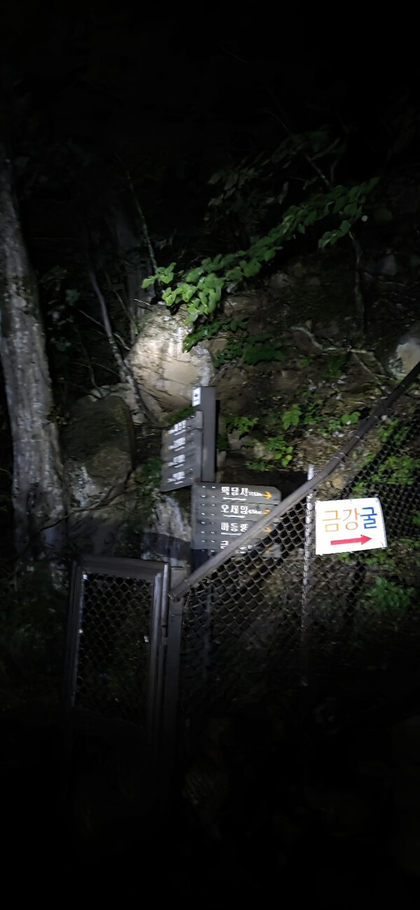 물론 동 트기 전이라서 아무것도 보이지 않았습니다. 왼쪽이 마등령으로 향하는 길이라는 표지판만 헤드랜턴 빛으로 확인하고 발걸음을 재촉했습니다.