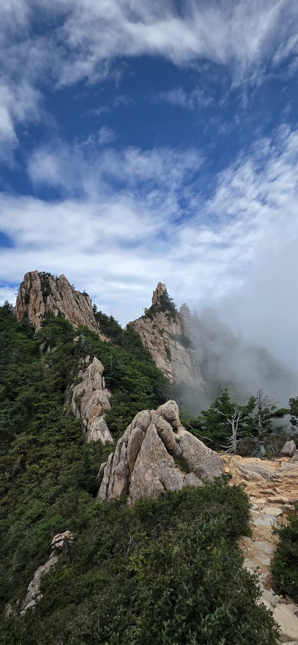깎아지른 듯한 기암괴석은 운해와 어우러지며 한 폭의 동양화가 눈 앞에 펼쳐지는 듯 했습니다. 이 상투적 표현 밖에 떠오르지 않는 장관이었습니다. 산등성이를 사이에 두고 내륙 쪽은 구름이 걷혀 푸르른 산자락과 봉우리 봉우리, 높은 가을 하늘이 펼쳐진 반면 동해 쪽은 온통 흰 구름에 가려 아무것도 보이지 않았습니다. 앞으로 펼쳐질 나의 미래처럼 말이죠. 구름은 넘실 넘실 안개가 되어 서쪽으로 넘어오며 사라졌습니다.