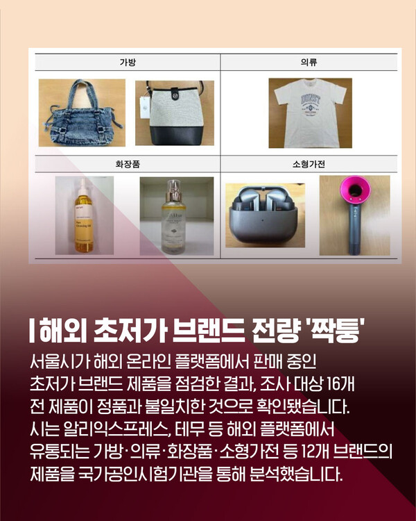 이전 기사보기 다음 기사보기 [카드뉴스] "싼 이유가 있었네" 해외 초저가 제품 점검 결과 전량 '짝퉁' 바로가기 복사하기 본문 글씨 줄이기 본문 글씨 키우기 스크롤 이동 상태바 카드뉴스 [카드뉴스] "싼 이유가 있었네" 해외 초저가 제품 점검 결과 전량 '짝퉁' 기자명 김아연 입력 2025.10.31 16:13 댓글 0 페이스북(으)로 기사보내기 트위터(으)로 기사보내기 URL복사(으)로 기사보내기 다른 공유 찾기 바로가기 본문 글씨 키우기 본문 글씨 줄이기 이 기사를 공유합니다 페이스북(으)로 기사보내기 트위터(으)로 기사보내기 URL복사(으)로 기사보내기 닫기 헬로tv뉴스 유튜브에서 헬로tv뉴스를 구독해주세요! [제보] 카카오톡 '헬로tv뉴스' 검색 후 채널 추가 김아연 dkdus66@lghv.net 키워드 #서울시 #해외브랜드 #저가 #최저가 #해외사이트 #초저가브랜드 #온라인몰 #온라인상품 #상품 #해외온라인플랫폼 #알리 #테무 #가방 #의류 #가짜 #짝퉁 #화장품 #성분 #상표 #위조 저작권자 © LG헬로비전 무단전재 및 재배포 금지 SNS 기사보내기 페이스북(으)로 기사보내기 트위터(으)로 기사보내기 URL복사(으)로 기사보내기 관련기사 서울시, 해외직구 초저가 브랜드 제품 16개 전량 '짝퉁' 확인 부산불꽃축제, 여기서 보면 '레전드'…'숨은 명당' 어디? 주요 뉴스 "시립병원 경영 위기 방치...서울시 공공의료 정책 후퇴" 제주항공 참사 유족, "사고조사위 독립성 부족·공청회 중단해야" 도박으로 수천억 탕진 20대…"우리 아들 구속시켜주세요" 인천 시민사회 "SL공사 인천시 이관…내년 직매립 금지 시행" 촉구 김미경 은평구청장 "자립준비청년 홀로서기 지역사회가 뒷받침" 김해 황새 폐사 원인 '대사성 근육질환' 추정 개의 댓글 댓글작성 작성자 비밀번호 댓글 내용입력 댓글 정렬 최신순 추천순 답글순 BEST댓글 BEST 댓글 답글과 추천수를 합산하여 자동으로 노출됩니다. 닫기 더보기 댓글삭제 삭제한 댓글은 다시 복구할 수 없습니다. 그래도 삭제하시겠습니까? 비밀번호 닫기 댓글수정 댓글 수정은 작성 후 1분내에만 가능합니다. 본문 / 400 비밀번호 닫기 내 댓글 모음 닫기 헬로 Edu [엄마Q] 요즘 아이들이 관계를 힘들어하는 진짜 이유? [교육은 지금] 지방은 교육이 약하다구요? 편견 깨는 신박한 학교들 [엄마Q] 에듀테크 200% 활용법, 제대로 쓰면 최고의 과외선생님! [교육은 지금] 인천 특수교사 비극 1년 후, 학교는 달라졌을까? [엄마Q] '에듀테크'가 뭐길래…우리 아이 공부도 달라진다고? [교육은 지금] 과학고 생긴다더니…초등학생까지 입시 전쟁 [엄마Q] "혼자 있고 싶어...근데 나 좀 봐줘" 우리아이 중2병 대처법! [교육은 지금] 질문력 = 미래 소득! 이런 학교 보셨나요? 헬로 리더스 어워드 [특집 대담] 도성훈 인천시교육감 "결대로 성장하는 인천 교육" [특집 대담] 김성수 해운대구청장 "일상도 관광처럼" [특집 대담] 이상호 태백시장 "청정에너지 도시로 부활" [특집 대담] 이상근 고성군수 "다채로운 매력의 도시, 경남 고성" [특집 대담] 신현국 문경시장 "시민만 바라보고 더욱 노력할 것” [특집 대담] 김미경 은평구청장 "구민과의 소통 최우선" [특집 대담] 최영일 순창군수 "순창형 복지 이뤄낼 것" [특집 대담] 이완섭 서산시장 "지역의 미래 기반 탄탄히 다질 것" 최신뉴스 11월 26일 인천, 강한 바람 '추위'…체감온도 더욱 낮아 [날씨] 11월 26일 (수) 충남 내일 가끔 비…5~10mm 부천시, 올해 10대 뉴스 선정…온라인 투표 진행 부천시, 자전거도로·시설물 점검 완료…어린이 안전 강화 황희찬, 부천에 5천만 원 기부…누적 2억 6천만 원 [다시보기] 헬로tv뉴스 경남 2025년 11월 25일