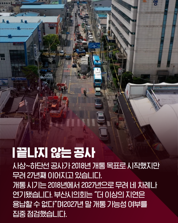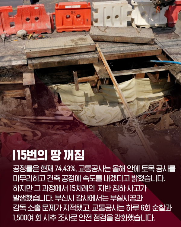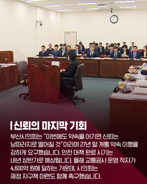 이전 기사보기 다음 기사보기 [카드뉴스] 툭하면 땅 꺼지는 사상~하단선…2027년 정말 개통될까? 바로가기 복사하기 본문 글씨 줄이기 본문 글씨 키우기 스크롤 이동 상태바 카드뉴스 [카드뉴스] 툭하면 땅 꺼지는 사상~하단선…2027년 정말 개통될까? 기자명 이현지 입력 2025.11.10 11:19 댓글 0 페이스북(으)로 기사보내기 트위터(으)로 기사보내기 URL복사(으)로 기사보내기 다른 공유 찾기 바로가기 본문 글씨 키우기 본문 글씨 줄이기 이 기사를 공유합니다 페이스북(으)로 기사보내기 트위터(으)로 기사보내기 URL복사(으)로 기사보내기 닫기 헬로tv뉴스 유튜브에서 헬로tv뉴스를 구독해주세요! [제보] 카카오톡 '헬로tv뉴스' 검색 후 채널 추가 이현지 cgcjcj@lghv.net 키워드 #사상하단선 #부산지하철 #개통지연 #지반침하 #부산시의회 #공사안전 #헬로tv뉴스 저작권자 © LG헬로비전 무단전재 및 재배포 금지 SNS 기사보내기 페이스북(으)로 기사보내기 트위터(으)로 기사보내기 URL복사(으)로 기사보내기 관련기사 툭하면 땅 꺼지는 사상~하단선…2027년 정말 개통될까? 부산불꽃축제, 여기서 보면 '레전드'…'숨은 명당' 어디? 주요 뉴스 "시립병원 경영 위기 방치...서울시 공공의료 정책 후퇴" 제주항공 참사 유족, "사고조사위 독립성 부족·공청회 중단해야" 도박으로 수천억 탕진 20대…"우리 아들 구속시켜주세요" 인천 시민사회 "SL공사 인천시 이관…내년 직매립 금지 시행" 촉구 김미경 은평구청장 "자립준비청년 홀로서기 지역사회가 뒷받침" 김해 황새 폐사 원인 '대사성 근육질환' 추정 개의 댓글 댓글작성 작성자 비밀번호 댓글 내용입력 댓글 정렬 최신순 추천순 답글순 BEST댓글 BEST 댓글 답글과 추천수를 합산하여 자동으로 노출됩니다. 닫기 더보기 댓글삭제 삭제한 댓글은 다시 복구할 수 없습니다. 그래도 삭제하시겠습니까? 비밀번호 닫기 댓글수정 댓글 수정은 작성 후 1분내에만 가능합니다. 본문 / 400 비밀번호 닫기 내 댓글 모음 닫기 헬로 Edu [엄마Q] 요즘 아이들이 관계를 힘들어하는 진짜 이유? [교육은 지금] 지방은 교육이 약하다구요? 편견 깨는 신박한 학교들 [엄마Q] 에듀테크 200% 활용법, 제대로 쓰면 최고의 과외선생님! [교육은 지금] 인천 특수교사 비극 1년 후, 학교는 달라졌을까? [엄마Q] '에듀테크'가 뭐길래…우리 아이 공부도 달라진다고? [교육은 지금] 과학고 생긴다더니…초등학생까지 입시 전쟁 [엄마Q] "혼자 있고 싶어...근데 나 좀 봐줘" 우리아이 중2병 대처법! [교육은 지금] 질문력 = 미래 소득! 이런 학교 보셨나요? 헬로 리더스 어워드 [특집 대담] 도성훈 인천시교육감 "결대로 성장하는 인천 교육" [특집 대담] 김성수 해운대구청장 "일상도 관광처럼" [특집 대담] 이상호 태백시장 "청정에너지 도시로 부활" [특집 대담] 이상근 고성군수 "다채로운 매력의 도시, 경남 고성" [특집 대담] 신현국 문경시장 "시민만 바라보고 더욱 노력할 것” [특집 대담] 김미경 은평구청장 "구민과의 소통 최우선" [특집 대담] 최영일 순창군수 "순창형 복지 이뤄낼 것" [특집 대담] 이완섭 서산시장 "지역의 미래 기반 탄탄히 다질 것" 최신뉴스 11월 26일 인천, 강한 바람 '추위'…체감온도 더욱 낮아 [날씨] 11월 26일 (수) 충남 내일 가끔 비…5~10mm 부천시, 올해 10대 뉴스 선정…온라인 투표 진행 부천시, 자전거도로·시설물 점검 완료…어린이 안전 강화 황희찬, 부천에 5천만 원 기부…누적 2억 6천만 원 [다시보기] 헬로tv뉴스 경남 2025년 11월 25일