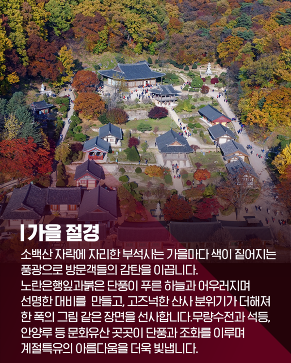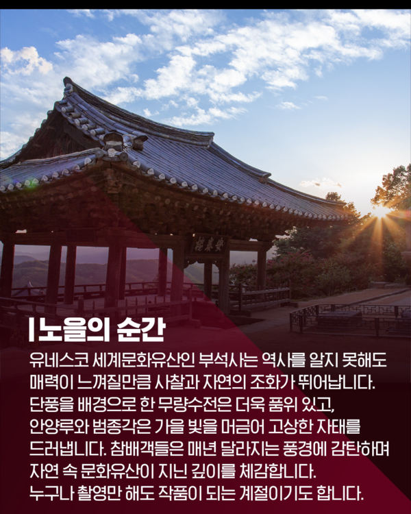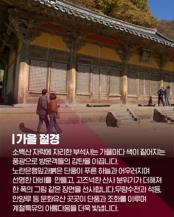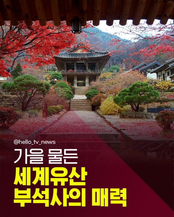 이전 기사보기 다음 기사보기 가을 정취도 '끝판왕' 세계유산 부석사 바로가기 복사하기 본문 글씨 줄이기 본문 글씨 키우기 스크롤 이동 상태바 문화 가을 정취도 '끝판왕' 세계유산 부석사 기자명 이현지 입력 2025.11.18 13:30 수정 2025.11.20 15:51 댓글 0 페이스북(으)로 기사보내기 트위터(으)로 기사보내기 URL복사(으)로 기사보내기 다른 공유 찾기 바로가기 본문 글씨 키우기 본문 글씨 줄이기 이 기사를 공유합니다 페이스북(으)로 기사보내기 트위터(으)로 기사보내기 URL복사(으)로 기사보내기 닫기 헬로tv뉴스 유튜브에서 헬로tv뉴스를 구독해주세요! [제보] 카카오톡 '헬로tv뉴스' 검색 후 채널 추가 이현지 cgcjcj@lghv.net 키워드 #부석사 #세계문화유산 #가을단풍 #소백산 #안양루 #무량수전 #가을여행 저작권자 © LG헬로비전 무단전재 및 재배포 금지 SNS 기사보내기 페이스북(으)로 기사보내기 트위터(으)로 기사보내기 URL복사(으)로 기사보내기 관련기사 가을 풍경도 세계적… 천년고찰 부석사의 만추(晩秋) 부산불꽃축제, 여기서 보면 '레전드'…'숨은 명당' 어디? 주요 뉴스 "시립병원 경영 위기 방치...서울시 공공의료 정책 후퇴" 제주항공 참사 유족, "사고조사위 독립성 부족·공청회 중단해야" 도박으로 수천억 탕진 20대…"우리 아들 구속시켜주세요" 인천 시민사회 "SL공사 인천시 이관…내년 직매립 금지 시행" 촉구 김미경 은평구청장 "자립준비청년 홀로서기 지역사회가 뒷받침" 김해 황새 폐사 원인 '대사성 근육질환' 추정 개의 댓글 댓글작성 작성자 비밀번호 댓글 내용입력 댓글 정렬 최신순 추천순 답글순 BEST댓글 BEST 댓글 답글과 추천수를 합산하여 자동으로 노출됩니다. 닫기 더보기 댓글삭제 삭제한 댓글은 다시 복구할 수 없습니다. 그래도 삭제하시겠습니까? 비밀번호 닫기 댓글수정 댓글 수정은 작성 후 1분내에만 가능합니다. 본문 / 400 비밀번호 닫기 내 댓글 모음 닫기 헬로 Edu [엄마Q] 요즘 아이들이 관계를 힘들어하는 진짜 이유? [교육은 지금] 지방은 교육이 약하다구요? 편견 깨는 신박한 학교들 [엄마Q] 에듀테크 200% 활용법, 제대로 쓰면 최고의 과외선생님! [교육은 지금] 인천 특수교사 비극 1년 후, 학교는 달라졌을까? [엄마Q] '에듀테크'가 뭐길래…우리 아이 공부도 달라진다고? [교육은 지금] 과학고 생긴다더니…초등학생까지 입시 전쟁 [엄마Q] "혼자 있고 싶어...근데 나 좀 봐줘" 우리아이 중2병 대처법! [교육은 지금] 질문력 = 미래 소득! 이런 학교 보셨나요? 헬로 리더스 어워드 [특집 대담] 도성훈 인천시교육감 "결대로 성장하는 인천 교육" [특집 대담] 김성수 해운대구청장 "일상도 관광처럼" [특집 대담] 이상호 태백시장 "청정에너지 도시로 부활" [특집 대담] 이상근 고성군수 "다채로운 매력의 도시, 경남 고성" [특집 대담] 신현국 문경시장 "시민만 바라보고 더욱 노력할 것” [특집 대담] 김미경 은평구청장 "구민과의 소통 최우선" [특집 대담] 최영일 순창군수 "순창형 복지 이뤄낼 것" [특집 대담] 이완섭 서산시장 "지역의 미래 기반 탄탄히 다질 것" 최신뉴스 11월 26일 인천, 강한 바람 '추위'…체감온도 더욱 낮아 [날씨] 11월 26일 (수) 충남 내일 가끔 비…5~10mm 부천시, 올해 10대 뉴스 선정…온라인 투표 진행 부천시, 자전거도로·시설물 점검 완료…어린이 안전 강화 황희찬, 부천에 5천만 원 기부…누적 2억 6천만 원 [다시보기] 헬로tv뉴스 경남 2025년 11월 25일
