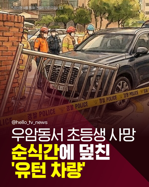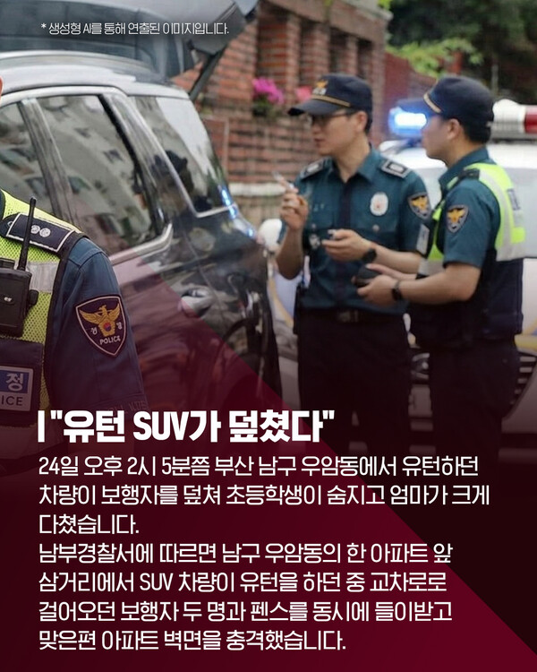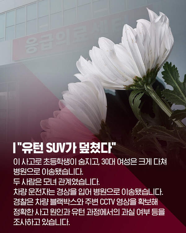 이전 기사보기 다음 기사보기 [카드뉴스] "유턴 SUV가 덮쳤다" 초등학생 사망, 엄마 중상 바로가기 복사하기 본문 글씨 줄이기 본문 글씨 키우기 스크롤 이동 상태바 카드뉴스 [카드뉴스] "유턴 SUV가 덮쳤다" 초등학생 사망, 엄마 중상 기자명 최은정 입력 2025.11.25 11:40 댓글 0 페이스북(으)로 기사보내기 트위터(으)로 기사보내기 URL복사(으)로 기사보내기 다른 공유 찾기 바로가기 본문 글씨 키우기 본문 글씨 줄이기 이 기사를 공유합니다 페이스북(으)로 기사보내기 트위터(으)로 기사보내기 URL복사(으)로 기사보내기 닫기 헬로tv뉴스 유튜브에서 헬로tv뉴스를 구독해주세요! [제보] 카카오톡 '헬로tv뉴스' 검색 후 채널 추가 최은정 amazing@lghv.net 키워드 #부산우암동사고 #유턴사고 #초등학생사망 #보행자사고 #교통사고 #교통참사 #모녀비극 #안전운전 #블랙박스 #CCTV #교통안전 #남부경찰서 #부산사건사고 #운전자과실 #안타까운소식 #삼거리사고 #도로안전 #경찰조사 #일상의위험 #보행자보호 저작권자 © LG헬로비전 무단전재 및 재배포 금지 SNS 기사보내기 페이스북(으)로 기사보내기 트위터(으)로 기사보내기 URL복사(으)로 기사보내기 부산불꽃축제, 여기서 보면 '레전드'…'숨은 명당' 어디? 주요 뉴스 "시립병원 경영 위기 방치...서울시 공공의료 정책 후퇴" 제주항공 참사 유족, "사고조사위 독립성 부족·공청회 중단해야" 도박으로 수천억 탕진 20대…"우리 아들 구속시켜주세요" 인천 시민사회 "SL공사 인천시 이관…내년 직매립 금지 시행" 촉구 김미경 은평구청장 "자립준비청년 홀로서기 지역사회가 뒷받침" 김해 황새 폐사 원인 '대사성 근육질환' 추정 개의 댓글 댓글작성 작성자 비밀번호 댓글 내용입력 댓글 정렬 최신순 추천순 답글순 BEST댓글 BEST 댓글 답글과 추천수를 합산하여 자동으로 노출됩니다. 닫기 더보기 댓글삭제 삭제한 댓글은 다시 복구할 수 없습니다. 그래도 삭제하시겠습니까? 비밀번호 닫기 댓글수정 댓글 수정은 작성 후 1분내에만 가능합니다. 본문 / 400 비밀번호 닫기 내 댓글 모음 닫기 헬로 Edu [엄마Q] 요즘 아이들이 관계를 힘들어하는 진짜 이유? [교육은 지금] 지방은 교육이 약하다구요? 편견 깨는 신박한 학교들 [엄마Q] 에듀테크 200% 활용법, 제대로 쓰면 최고의 과외선생님! [교육은 지금] 인천 특수교사 비극 1년 후, 학교는 달라졌을까? [엄마Q] '에듀테크'가 뭐길래…우리 아이 공부도 달라진다고? [교육은 지금] 과학고 생긴다더니…초등학생까지 입시 전쟁 [엄마Q] "혼자 있고 싶어...근데 나 좀 봐줘" 우리아이 중2병 대처법! [교육은 지금] 질문력 = 미래 소득! 이런 학교 보셨나요? 헬로 리더스 어워드 [특집 대담] 도성훈 인천시교육감 "결대로 성장하는 인천 교육" [특집 대담] 김성수 해운대구청장 "일상도 관광처럼" [특집 대담] 이상호 태백시장 "청정에너지 도시로 부활" [특집 대담] 이상근 고성군수 "다채로운 매력의 도시, 경남 고성" [특집 대담] 신현국 문경시장 "시민만 바라보고 더욱 노력할 것” [특집 대담] 김미경 은평구청장 "구민과의 소통 최우선" [특집 대담] 최영일 순창군수 "순창형 복지 이뤄낼 것" [특집 대담] 이완섭 서산시장 "지역의 미래 기반 탄탄히 다질 것" 최신뉴스 11월 26일 인천, 강한 바람 '추위'…체감온도 더욱 낮아 [날씨] 11월 26일 (수) 충남 내일 가끔 비…5~10mm 부천시, 올해 10대 뉴스 선정…온라인 투표 진행 부천시, 자전거도로·시설물 점검 완료…어린이 안전 강화 황희찬, 부천에 5천만 원 기부…누적 2억 6천만 원 [다시보기] 헬로tv뉴스 경남 2025년 11월 25일