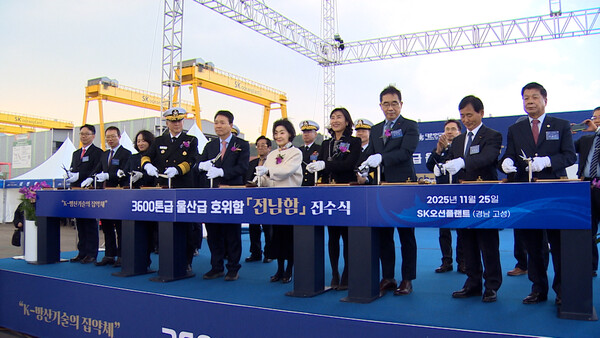 [이승철 / SK오션플랜트 대표이사 : SK오션플랜트는 방위산업 진출 이후 국가안보의 전략 파트너로서 끊임없는 기술 혁신과 품질 향상에 노력해 왔습니다. 오늘 진수되는 전남함은 그간의 경험과 역량이 집약된 결과물이며….]